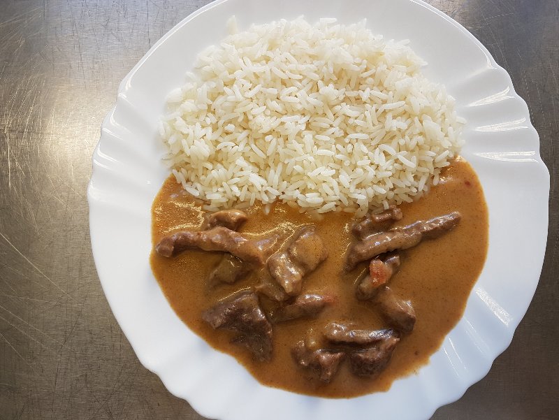 Polévka zeleninový vývar s játrovým kapáním - Hovězí maso na paprice a hříbcích,