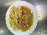 Radvanské vepřové maso (kořenová zelenina, hrášek, okurka ster., smetana) [1, 7, 9, 12] , těstoviny [1, 3]