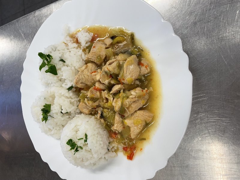 Kuřecí soté se zeleninou [1, 7] rýže dušená